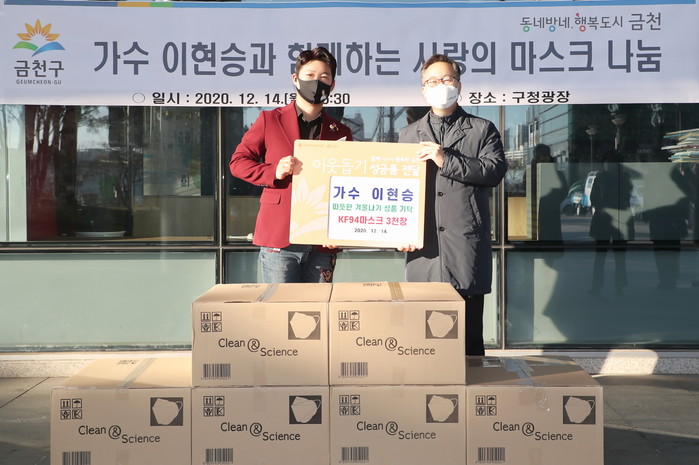 서울 금천구는 14일 가수 이현승씨와 팬카페(동반자) 회원들로부터 지역 취약계층을 위한 KF94 마스크 3000장을 전달받았다. 사진은 전달식에서 유성훈 구청장(오른쪽)과 이씨가 기념촬영을 하는 모습. (사진제공=금천구청)