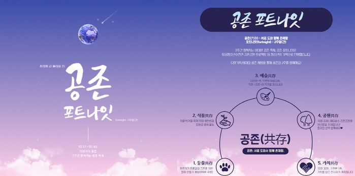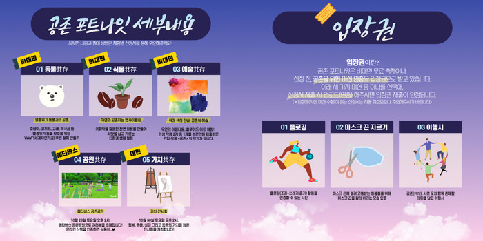 다섯 가지 테마(동물, 식물, 예술, 공원, 가치)별 다양한 즐길 거리와 비대면 체험 및 메타버스를 활용한 온라인 공원 산책, 공존의 가치를 담은 전시회가 무료로 진행되며 테마별 체험 신청 시 미션 수행을 통해 획득한 입장권을 제출하면 참가가 가능하다.