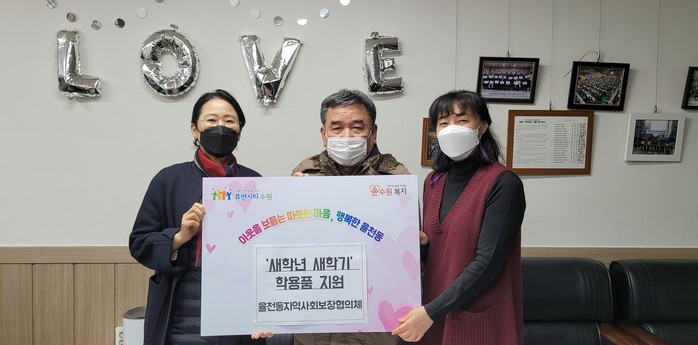 지난 19일 경기 수원시 장안구 율천동 지역사회보장협의체는 오는 3월에 새 학년을 시작하는 신입생 저소득층 자녀 20명에게 학용품 상품권(100만원 상당)을 전달했다. 사진은 전달식에 참석한 관계자들이 기념촬영을 하는 모습. (사진제공=장안구청)