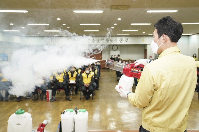 26일 종로구가 코로나19가 ‘심각’ 단계로 격상함에 따라 지역사회 확산을 적극적으로 방지하기 위해 특별방역단을 꾸리고 본격 활동에 들어갔다. 사진은 사전 교육에서 방역기 시범을 보이고 있는 강사의 모습. (사진제공=종로구청)