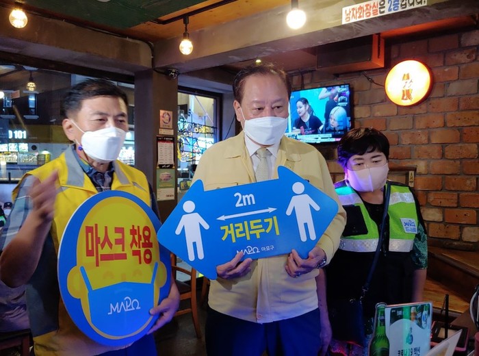 서울 마포구는 최근 유동균 구청장을 필두로 하는 민·관·경 특별방역 합동점검반을 구성해 클럽밀집지역인 홍익문화공원~KT&G 상상마당을 이동하며 6인 이상 사적모임금지 등을 집중 점검했다. 사진은 유 구청장(가운데)이 홍대 인근 상점에서 방역수칙을 안내하는 모습.(사진제공=마포구청)