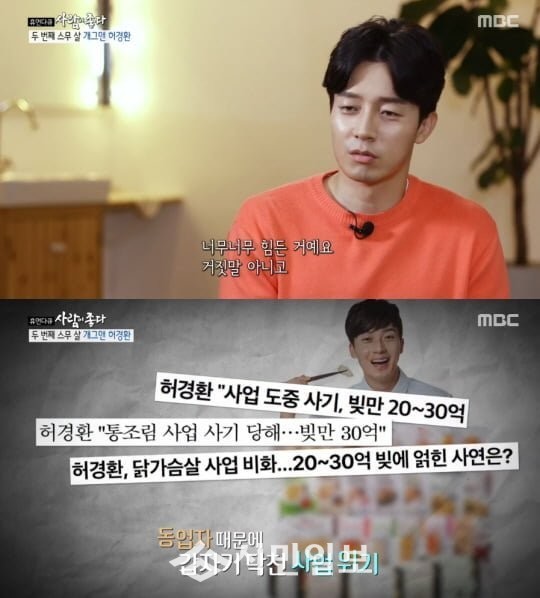 이날 허경환은 닭가슴살 회사를 운영하다 빚더미에 앉았었다고 고백했다. 지난해에는 매출 200억을 달성하며 승승장구했지만 항상 순탄하지많은 않았다고. 사업 초기 그는 믿었던 동업자의 배신으로 20~30억 원의 빚을 져 마음고생이 이만저만이 아니었다고.