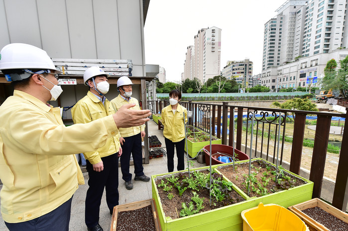인천 부평구는 여름철 자연재난에 대비하기 위해 최근 갈산유수지 일원 하수암거 악취개선사업 공사 현장에 방문해 하수시설 공사 진행 상황 등을 점검했다. 사진은 차준택 구청장(왼쪽 두 번째)이 관계자로부터 공사 진행상황에 대해 듣고 있는 모습. (사진제공=부평구청)