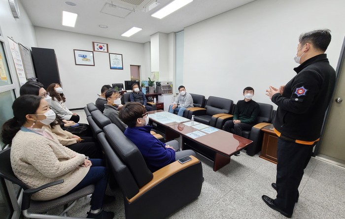 경기 수원시 장안구 연무동은 2일 겨울철 화재 발생시 초기대응능력을 키우기 위해 전직원을 대상으로 합동 소방훈련을 실시했다. 전직원은 이의119안전센터에서 제공한 시청각자료를 시청하고 화재 상황전파, 화재 초기 진화방법 등에 대해 배웠다. 사진은 이날 교육이 진행되고 있는 모습. (사진제공=수원시청)