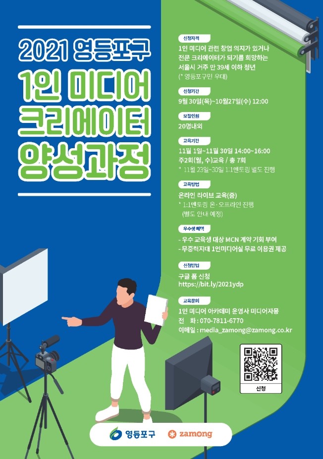 [시민일보 = 여영준 기자] 영등포구(구청장 채현일)는 청년들의 미디어 콘텐츠 제작 역량 향상과 관련분야 취·창업을 지원하기 위해 오는 11월1~30일 ‘1인 미디어 크리에이터 양성 과정’을 운영한다고 밝혔다.