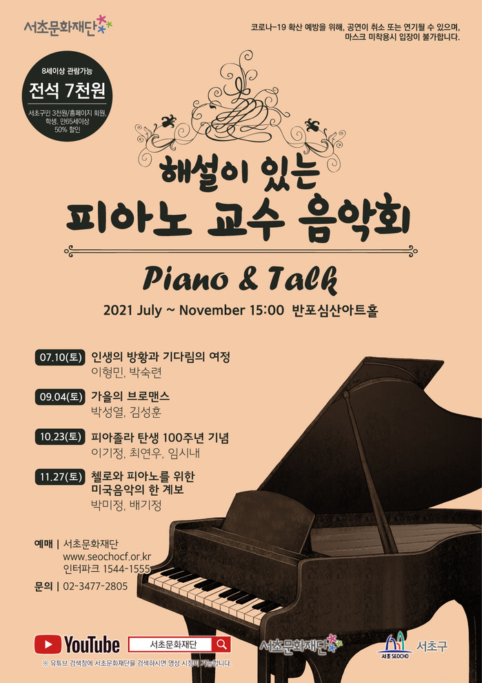 해설이 있는 피아노 교수음악회 “Piano & Talk”는 최고의 자질과 역량을 갖춘 국내·외 유수 대학의 피아노 전공 교수들로 구성된 서초국제예술단의 연주와 해설을 곁들여 클래식 음악과 대중 간의 거리를 좁힐 예정이다.
