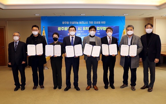 광주광역시는 9일 광주시 비즈니스룸에서 인공지능(AI) 전문기업인 ㈜AIET, 디포커스㈜, ㈜마크애니, ㈜스프링클라우드, 티쓰리큐㈜와 광주형 인공지능 비즈니스 기반 조성을 위한 56~60번째 업무협약을 체결하고 각 기업별 법인설립 또는 지역사무소 설립을 추진한다.