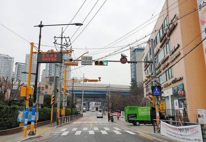 서울 성동구가 어린이들에게 안전한 통학로를 조성하기 위해 행당초등학교 등 지역내 7개 초등학교 통학로에 '성동형 스마트 횡단보도' 설치를 완료했다고 17일 밝혔다. 사진은 옥정초교 앞 스마트 횡단보도.