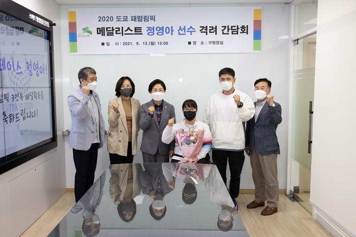 서울 은평구는 2020 도쿄 패럴림픽 탁구 여자단식 TT5 종목에서 동메달을 획득한 정영아 선수를 격려하는 간담회를 열었다. 정 선수는 2012 런던 패럴림픽, 2016 리우데자네이루 패럴림픽을 포함해 3번 연속으로 메달을 획득하는 위엄을 달성했다. 사진은 김미경 구청장(왼쪽에서 세 번째)이 정 선수 및 관계자들과 기념촬영을 하는 모습.(사진제공=은평구청)