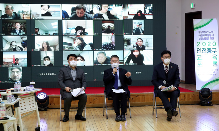 인천 중구가 지난 24일 평생학습도시와 마을교육공동체 발전방안을 위한 '2020 인천 중구 교육 포럼'을 개최했다. 이번 포럼은 유튜브와 화상회의 앱을 통해 지역내 교사, 학부모, 마을교육활동가, 주민 등이 참여한 가운데 전문가 토론, 토크콘서트 등으로 진행됐다. 사진은 토크콘서트에서 참여한 홍인성 구청장(가운데)이 주민들의 질의에 답변하는 모습. (사진제공=인천중구청)