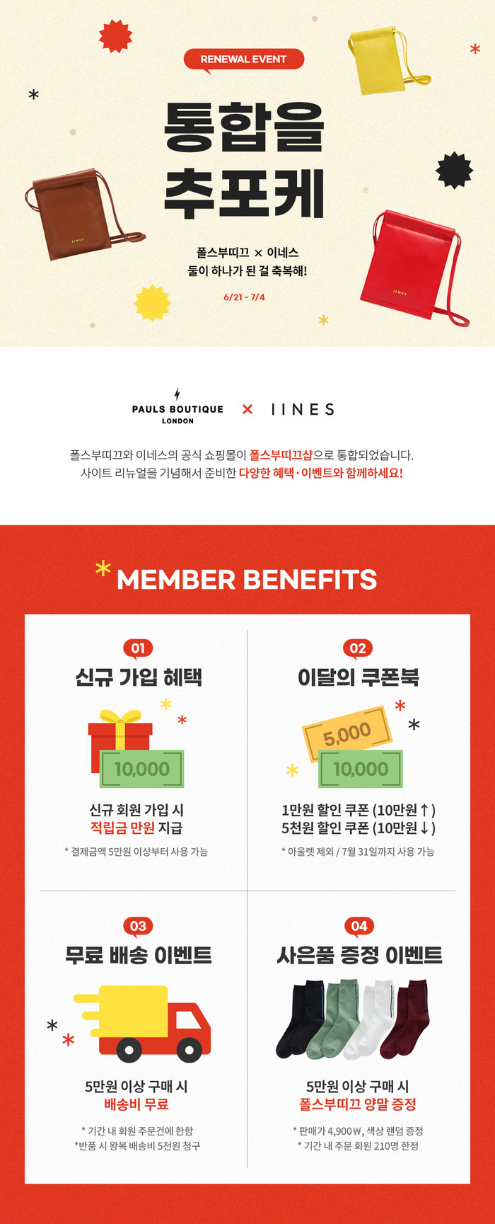 홈페이지 리뉴얼 프로모션으로는 신규가입시 1만원 적립금과 즉시 사용 가능한 최대 1만원 할인쿠폰이 제공되고 10만원 이상 구매시 폴스부띠끄 양말이 증정된다.