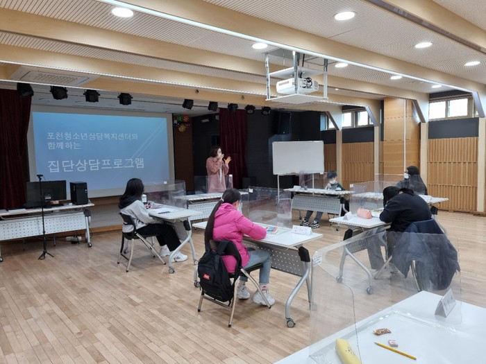 경기 포천시청소년상담복지센터는 지난 22~24일 포천시청소년문화의집에서 찾아가는 집단상담을 실시해 중학교 1학년 학생들을 대상으로 사회성 향상에 도움이 되는 프로그램을 진행했다. 사진은 학생들과 집단상담을 진행하고 있는 모습. (사진제공=포천시청)