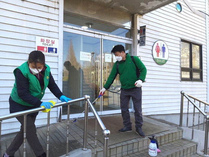 경기 안산시 단원구 와동 새마을회는 최근 와동 행정복지센터 주변 버스정류장·벤치 등 공공시설물과 방문 민원이 많은 민원실 입구와 주차장 일대에서 코로나19 감염예방을 위한 방역활동을 펼쳤다. 사진은 이날 회원들이 공중화장실을 소독하고 있는 모습. (사진제공=안산시청)