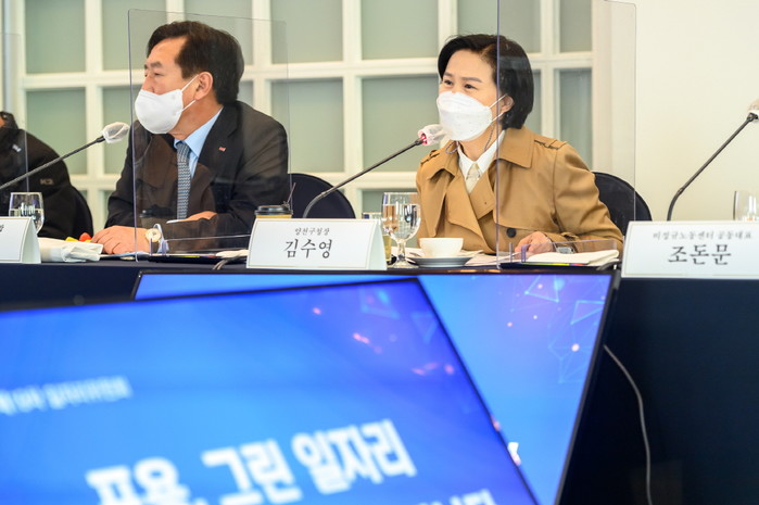 김수영 서울 양천구청장은 최근 ‘포용, 그린 일자리 국민과 함께 만들어 갑니다’라는 주제로 진행된 제19차 일자리 위원회에 참석했다. 사진은 이날 위원회에서 김 구청장(오른쪽)이 발언을 하고 있는 모습. (사진제공=양천구청)