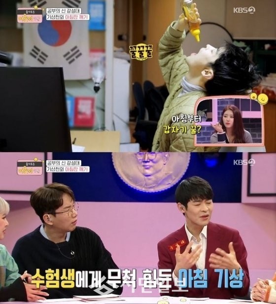 이어서 강성태가 한 것은 바로 꿀 마시는 것. 강성태의 아침 꿀 드링킹은 모두의 눈을 의심케 했다. 강성태는 "학생들이 아침에 일어나려면 힘들지 않나. 근데 저는 어렸을 때 어머니께서 입에 엿을 넣어주셨다. 달콤한 게 입에 들어오면 잠이 깬다"면서 웃음을 터뜨렸다.