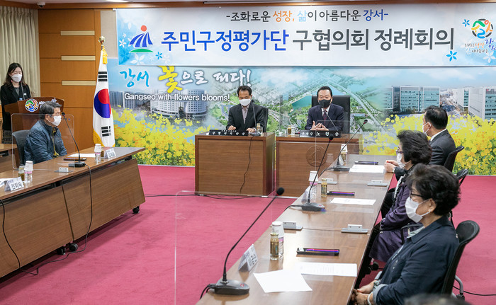 서울 강서구는 28일 ‘2020년 주민구정평가단 구협의회 정례회의’를 개최하고 코로나19로 지친 중·장년층을 위한 비대면 프로그램 운영 등 주요 현안사업 추진현황에 대해 논의했다. 사진은 노현송 구청장(왼쪽에서 세 번째)이 회의를 주재하고 있는 모습. (사진제공=강서구청)