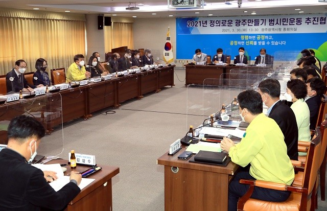 광주시는 30일 시청 중회의실에서 시민사회단체, 자원봉사센터, 유관기관 대표 및 자치구 관계자 등 34명이 참여한 가운데 ‘정의로운 광주만들기 범시민운동 추진협의회’를 개최했다.
