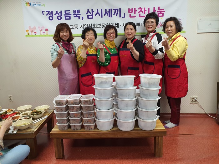 경기 수원시 팔달구 매교동은 최근 새마을부녀회 회원들과 함께 지역내 저소득 소외계층을 위한 ‘정성 듬뿍, 삼시세끼’ 반찬 나눔 행사를 진행했다. 사진은 참여자들이 기념촬영을 하는 모습. (사진제공=팔달구청)