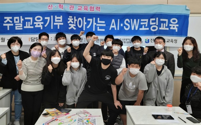 전남도교육청은 최근 미래인재 육성을 위해 나주공산중학교에서 한전KDN-조선대학교와 함께 주말 학교로 찾아가는 SW코딩교육을 운영했다. 이날 SW코딩교육은 올해 두 번째 교육활동으로 전교생 3분의 1가량이 참여하는 등 높은 관심을 보였다. 사진은 이날 교육에 참여한 학생들과 관계자들이 기념촬영을 하는 모습. (사진제공=전라남도교육청)