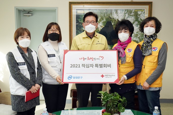 서울 동대문구가 13일 대한적십자사 서울특별시지사에 2021년 대한적십자사 특별회비 100만원을 전달했다. 사진은 적십자 특별회비 전달식에서 유덕열 구청장(가운데)과 관계자들이 기념촬영을 하고 있는 모습. (사진제공=동대문구청)