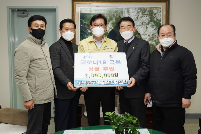 서울 동대문구는 지난 22일 동대문구체육발전위원회로부터 코로나19 극복을 위한 성금 300만원을 전달받았다. 사진은 전달식에서 유덕열 구청장(가운데)이 관계자들과 기념촬영을 하는 모습. (사진제공=동대문구청)