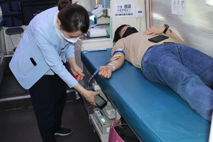 서울 광진구시설관리공단 직원들이 최근 혈액 수급이 부족한 상황을 극복하고자 ‘사랑의 단체헌혈’ 봉사에 참여했다. 이번 헌혈 봉사는 코로나19 장기화로 적정 수준의 혈액 보유가 어려운 의료계의 고통을 분담하고자 추진됐다. 사진은 이날 직원이 헌혈을 하고 있는 모습. (사진제공=광진구청)