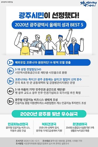 이와 함께, 2위 ‘5·18 상징 전일빌딩245, 시민역사문화공간으로 재탄생·시민품으로 환원’ ▲3위 ‘코로나19는 죽이고! 광주 공동체는 살리고! ‘협업’이 신의 한수’ ▲4위 ‘5·18 아픔의 기억! 민주인권 공간으로 재탄생!’▲5위 ‘광주형 인공지능 비즈니스 생태계 조성’이 선정됐다.