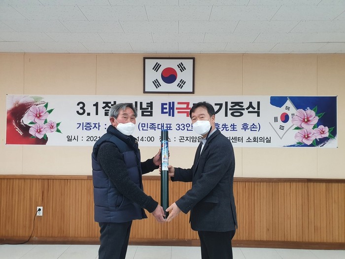 경기 광주시 곤지암읍 행정복지센터에 최근 민족대표 33인 이종훈 선생의 후손인 이주동 광복회 명예회원이 3.1절을 맞아 애국심 제고를 위한 가정용 태극기 500장을 기증했다. 사진은 이씨가 태극기를 기증하는 모습. (사진제공=광주시청)