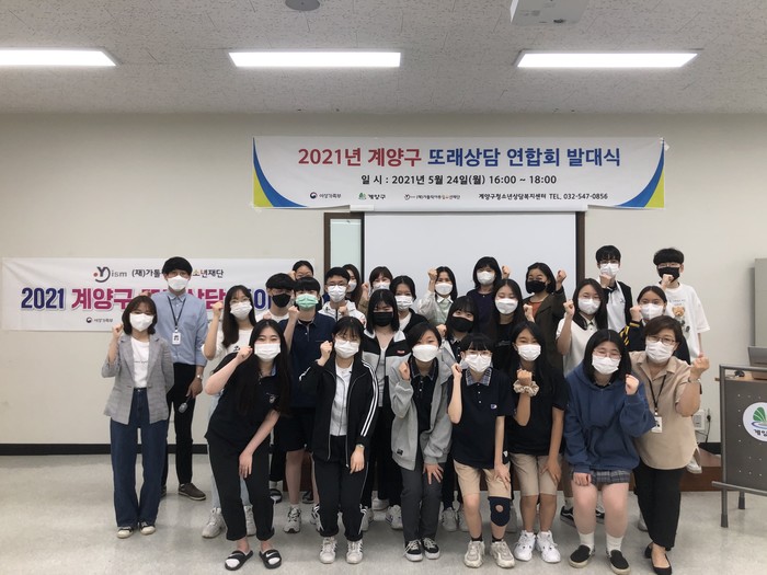 인천 계양구청소년상담복지센터가 지난 24일 '2021년 계양구 또래상담연합회 발대식'을 개최했다. 이날 지역내 중학교 3곳·고등학교 7곳 총 19명의 또래상담자에게 위촉장을 수여했으며, 또래상담자들은 학교폭력 예방활동을 솔선수행할 것을 다짐했다. 사진은 발대식에서 또래상담자들이 기념촬영을 하는 모습. (사진제공=계양구청)