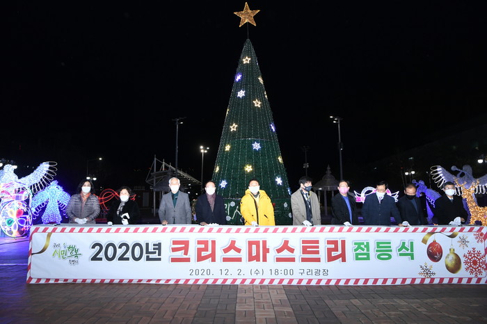 경기 구리시가 최근 구리광장에서 코로나19로 지친 시민들을 위로하는 '2020년 크리스마스트리 점등식'을 개최했다. 트리는 광장 등 지역내 3곳에 설치돼 오는 2021년 1월까지 운영된다. 사진은 안승남 시장(왼쪽 다섯 번째)과 관계자들이 기념촬영을 하는 모습. (사진제공=구리시청)