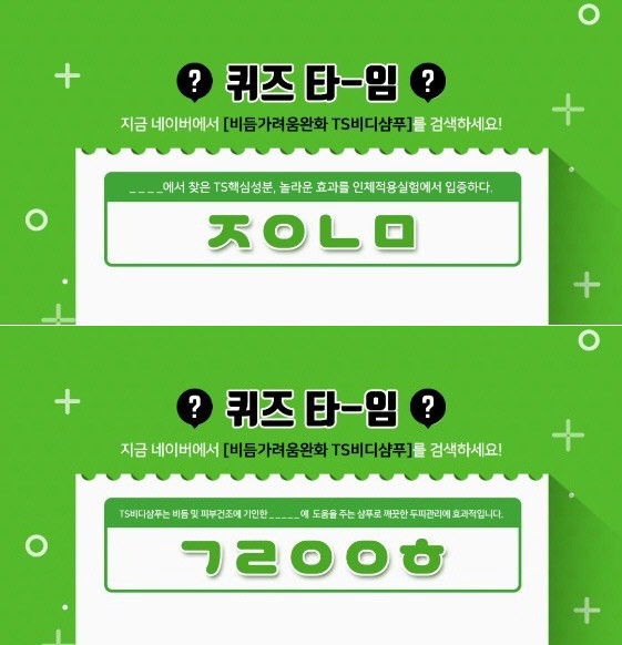 두 번째 문제는 “TS비디샴푸는 비듬 및 피부건조에 기인한 ㄱㄹㅇㅇㅎ에 도움을 주는 샴푸로 깨끗한 두피관리에 효과적입니다”의 초성을 맞히는 것으로 정답은 ‘가려움완화’다.