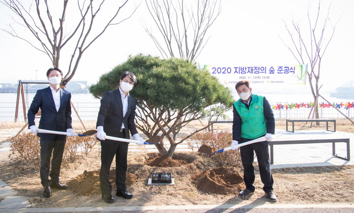 인천 서구새마을회는 12일 구유지(오류동 1551번지) 일대에 면적 1320㎡규모의 숲을 조성해 도심속 주민 쉼터인 ‘서구지방재정의 숲’ 준공식을 열었다. 사진은 준공식에서 이재현 구청장(가운데)과 관계자들이 기념식수를 하는 모습. (사진제공=서구청)