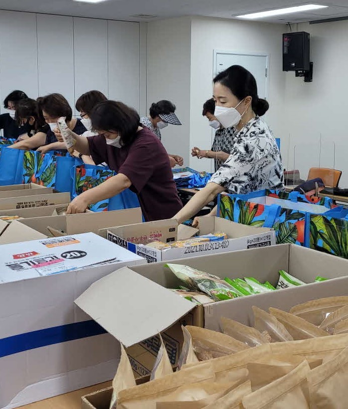 | ▲ 이웃살피미들이 안부확인 대상자들에게 전달할 보듬 꾸러미를 포장하고 있는 모습. (사진제공=성북구청) |