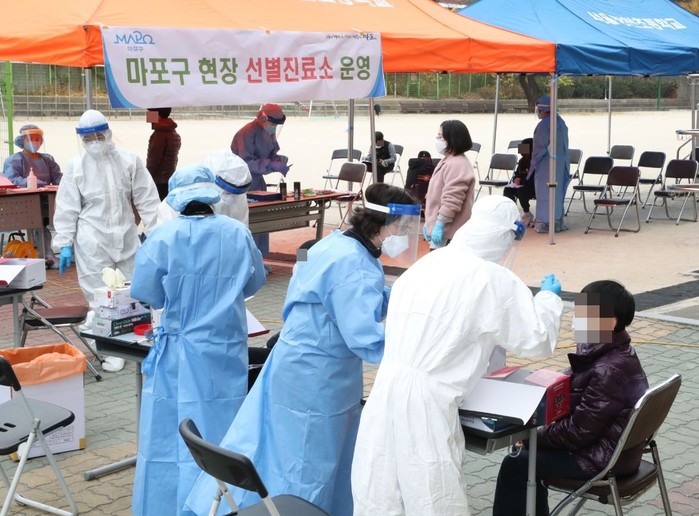 서울 마포구 창천초등학교 학생 1명이 코로나19 확진 판정을 받음에 따라 17일 학교 운동장에 마포구 현장 선별진료소가 설치됐다. 구는 선제적 대응으로 창천초 학생 및 교직원 등에 대한 전수검사를 했다. 사진은 선별진료소에서 한 학생의 검체를 채취하고 있는 모습. (사진제공=마포구청)