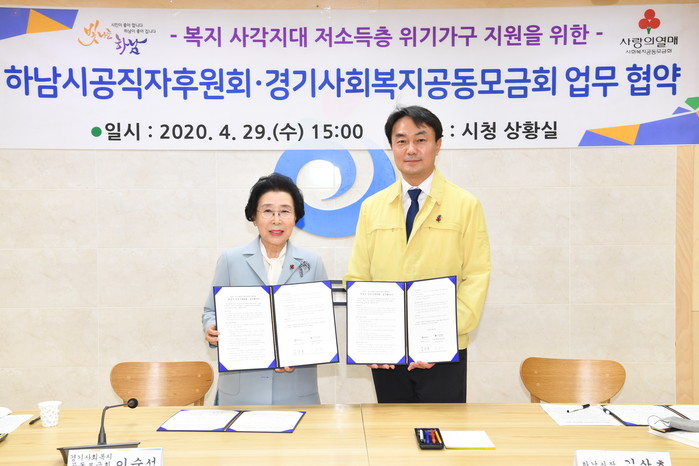 경기 하남시 공직자후원회가 최근 시청 상황실에서 경기사회복지공동모금회와 체계적인 복지사각지대 저소득층 위기가구 지원을 위한 업무협약을 체결했다. 사진은 협약 체결 후 김상호 시장(오른쪽)과 이순선 공동모금회 회장이 기념촬영을 하는 모습. (사진제공=하남시청)