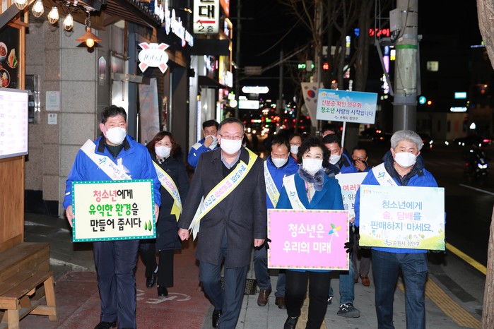 경기 수원시 장안구가 3일 건전한 청소년 문화 육성 및 탈선 예방을 위해 수능을 마친 청소년을 대상으로 '청소년 탈선 예방 합동 캠페인'을 송죽동·조원동 일대에서 전개했다. 사진은 이범선 구청장(왼쪽 두 번째)과 참가자들이 손팻말을 들고 캠페인을 하고 있는 모습. (사진제공=장안구청)