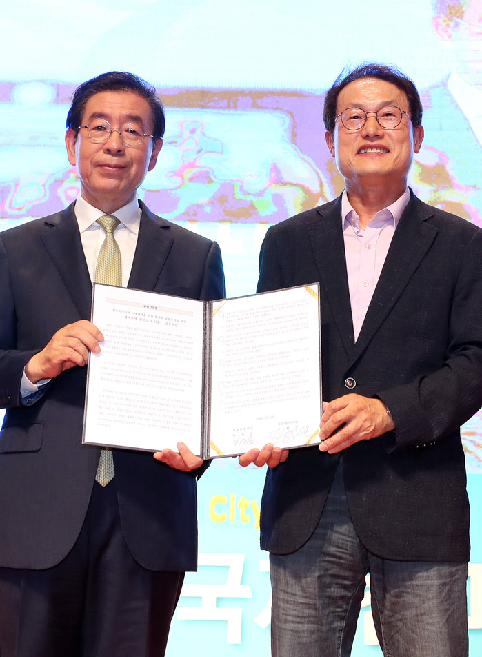 박원순 서울시장(왼쪽)과 조희연 서울시교육감이 26일 오전 서울시청에서 열린 2019 서울 전환도시 국제 콘퍼런스에서 '생태문명 전환도시 서울' 공동선언문에 서명한 뒤 기념촬영을 하고 있다. 국내외 석학과 오피니언 리더, 세계도시 지속가능성 담당 공무원 등이 모이는 이 행사는 경제 성장 위주의 산업문명에서 경제적 가치보다 환경과의 조화를 추구하는 생태문명으로의 전환을 꾀하는 움직임을 조명한다.