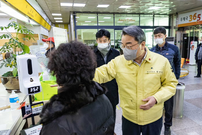 광진구가 지난 3일 설 명절을 앞두고 동서울우편집중국과 광진우체국 직원들을 격려하기 위해 KF94 마스크 4만7000여장을 전달했으며, 전통시장 상인과 개인택시 운전자·환경미화원 등을 대상으로 총 9만6000여장의 마스크를 지급했다. 사진은 김선갑 구청장(오른쪽)이 광진우체국에 방문한 주민에게 발열확인 방법을 안내하고 있는 모습. (사진제공=광진구청)