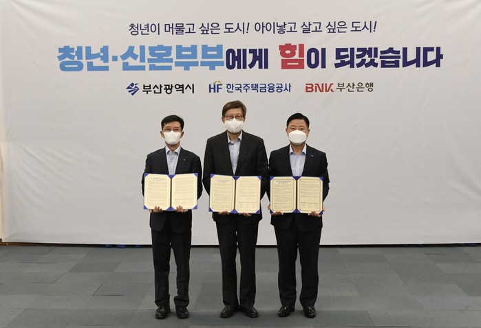 [시민일보 = 여영준 기자]BNK부산은행이 18일 오전, 부산시청에서 부산광역시, 한국주택금융공사와 ‘청년·신혼부부 주택임차보증금 지원 사업’ 업무 협약을 체결했다고 밝혔다.