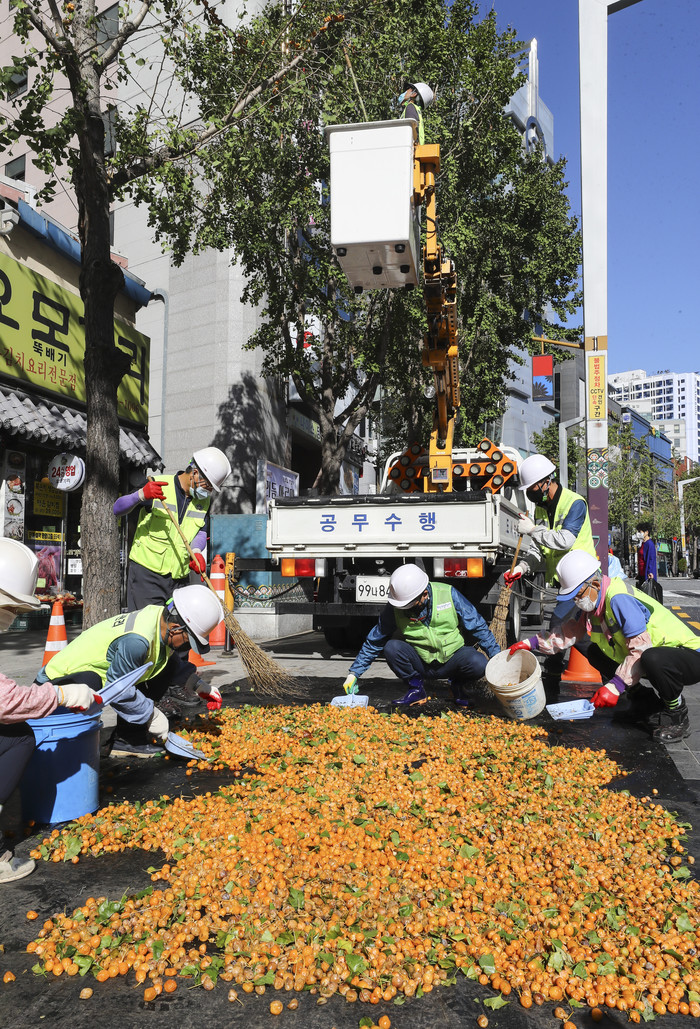 6일 부산시 부산진구 서면문화로에서 은행나무 열매를 채취하는 작업이 한창이다. 부산진구는 채취한 은행나무 열매를 중금속 검사를 거쳐 경로당이나 사회복지시설 등에 전달할 계획이다.