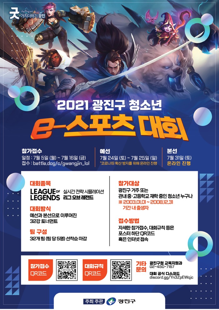 [시민일보 = 여영준 기자] 서울 광진구(구청장 김선갑)가 오는 31일 지역내 중·고등학생을 대상으로 청소년 e-스포츠 대회를 온라인으로 개최한다.