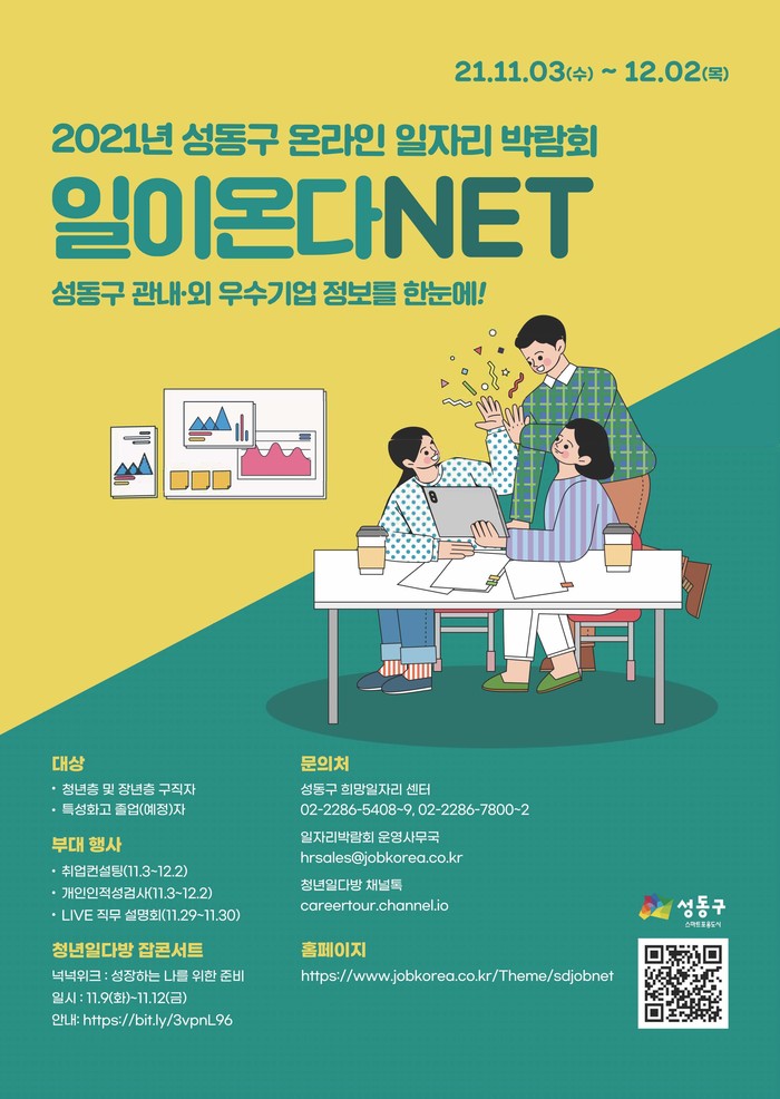 [시민일보 = 홍덕표 기자] 서울 성동구(구청장 정원오)는 3일부터 오는 12월2일까지 언택트 일자리박람회 ‘일이 온다넷(NET)’을 개최하며 박람회에 참여할 구인 기업을 모집한다.
