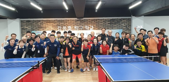 | ▲ B.L.P 봉사단과 강동훈 탁구학교 회원들이 기념 촬영을 하고 있다.(사진제공=보람상조) |