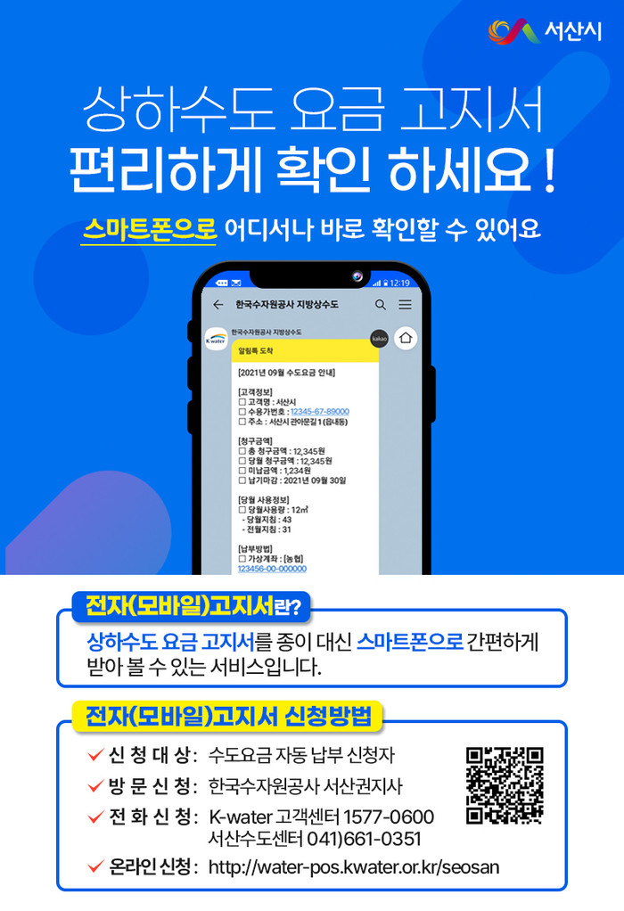 | ▲ 서산시 상하수도요금 전자고지서 서비스 안내문. (사진제공=서산시청) |