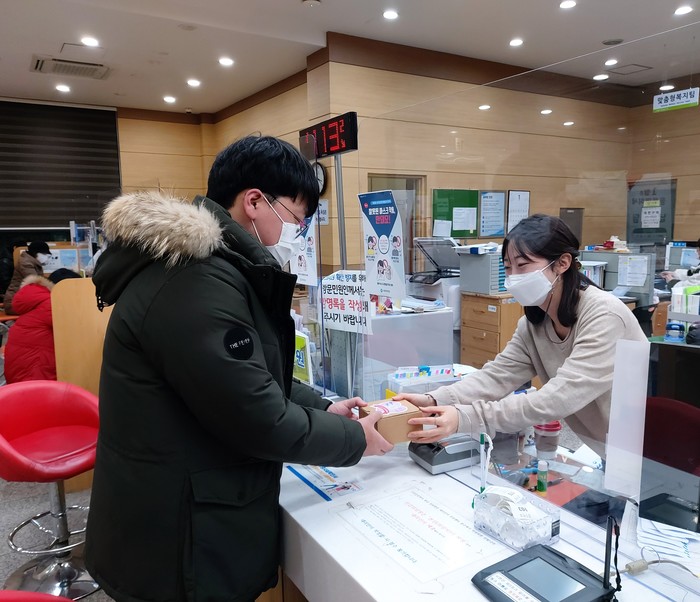 경기 수원시 장안구 조원1동은 지난 22일 출생신고를 하기 위해 방문한 주민에게 아기탄생을 축하하는 카드와 함께 가제손수건세트를 선물로 증정했다. ‘첫 만남의 기쁨! 행복나눔 출생축하’ 사업은 출산장려 분위기를 조성하기 위해 조원1동 주민자치위원회의 후원을 받아 추진하고 있다. 사진은 조원1동 행정복지센터 직원이 주민에게 선물을 증정하고 있는 모습. (사진제공=장안구청)
