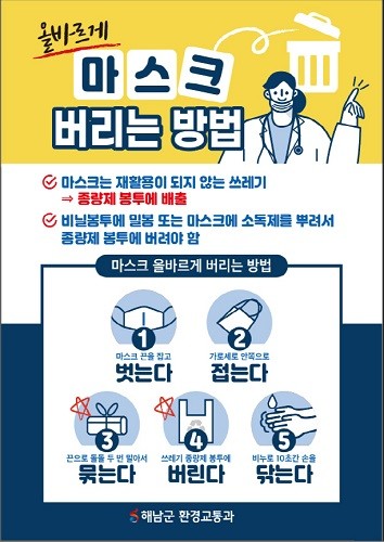 이에 따라 해남군은 마을 회관등에 안내문을 부착하고, 이장회의를 비롯해 군 홈페이지, SNS 등을 통해 주민들에게 폐마스크의 올바른 폐기방법을 적극 알리고 있다.