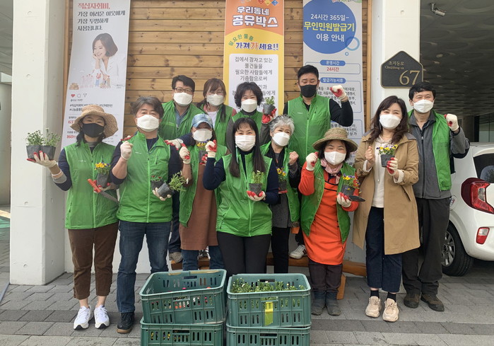 경기 안산시 단원구 초지동 주민자치위원회는 최근 코로나19로 지친 주민들의 마음을 위로하기 위해 초지동 지역내 상가거리 및 행정복지센터 주변에 비올라·팬지 등 봄꽃 1000여본을 심었다. 사진은 이날 참여한 위원들이 기념촬영을 하는 모습. (사진제공=안산시청)