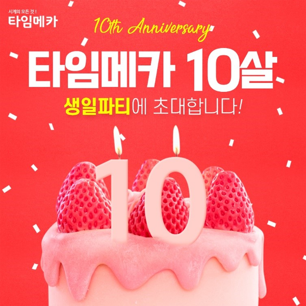 [시민일보 = 이승준] 온라인 시계 종합몰 타임메카가 10주년을 맞아 ‘타임메카 10살 생일파티 초대’ 이벤트를 5월 17일부터 6월 25일까지 진행한다고 밝혔다.