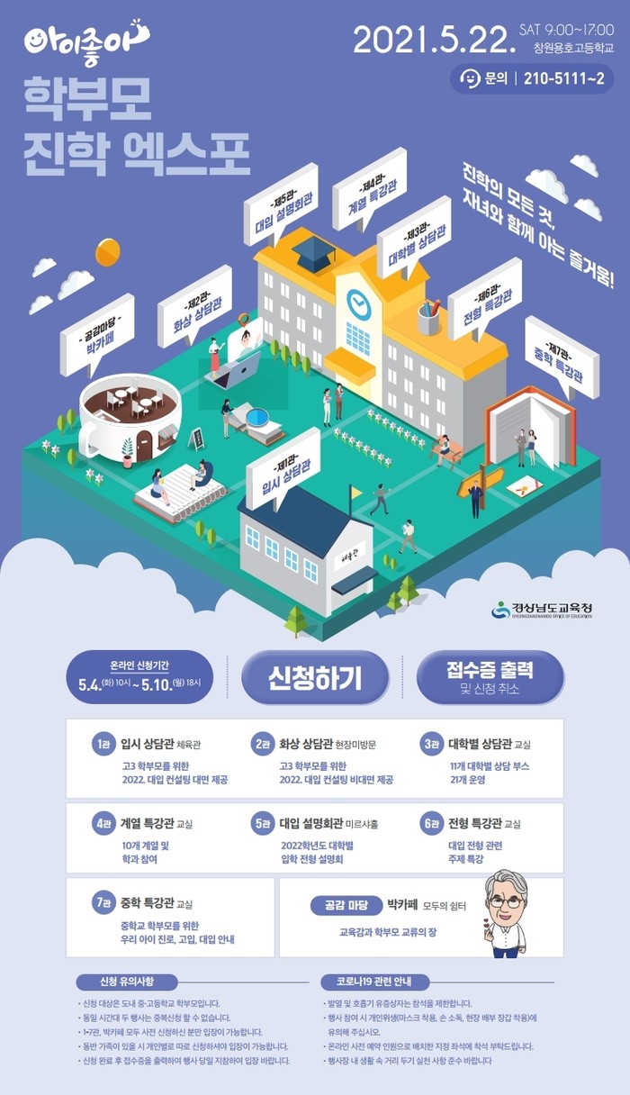 경상남도교육청(교육감 박종훈)은 22일 창원용호고에서 ‘아이좋아 2021. 학부모진학엑스포’를 개최한다. 시간은 오전 9시부터 오후 5시까지이며, 행사에는 도내 중ㆍ고등학교 학부모 1,300여 명이 참가한다.