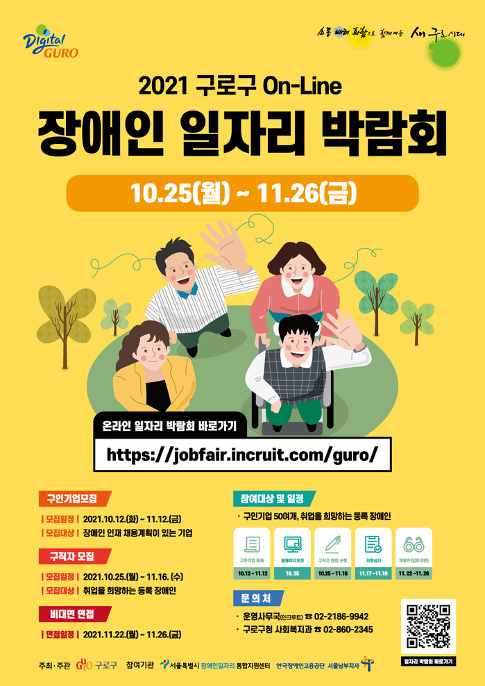 [시민일보 = 이대우 기자] 서울 구로구(구청장 이성)가 오는 11월26일까지 ‘온라인 장애인 일자리 박람회’를 개최한다.